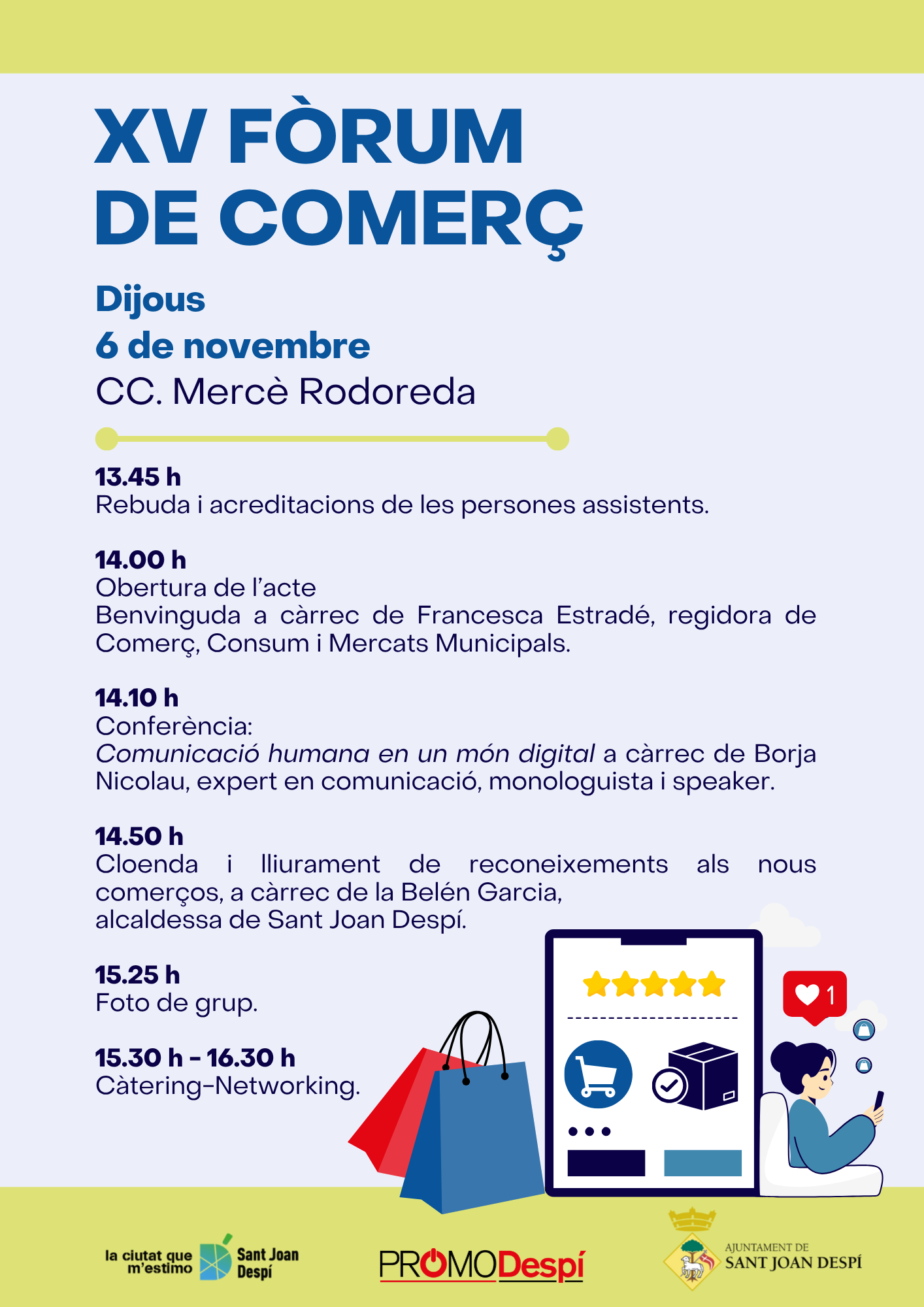 Cada any l’Ajuntament de Sant Joan Despí, amb l’objectiu de promoure l’activitat comercial al territori, organitza el Fòrum de Comerç. L’objectiu del Fòrum és fer balanç de la situació local en termes de consum, afavorir espais de trobada per dialogar, intercanviar opinions, reflexionar i compartir experiències que permetin establir nous contactes i alhora tractar temes d’interès general.
