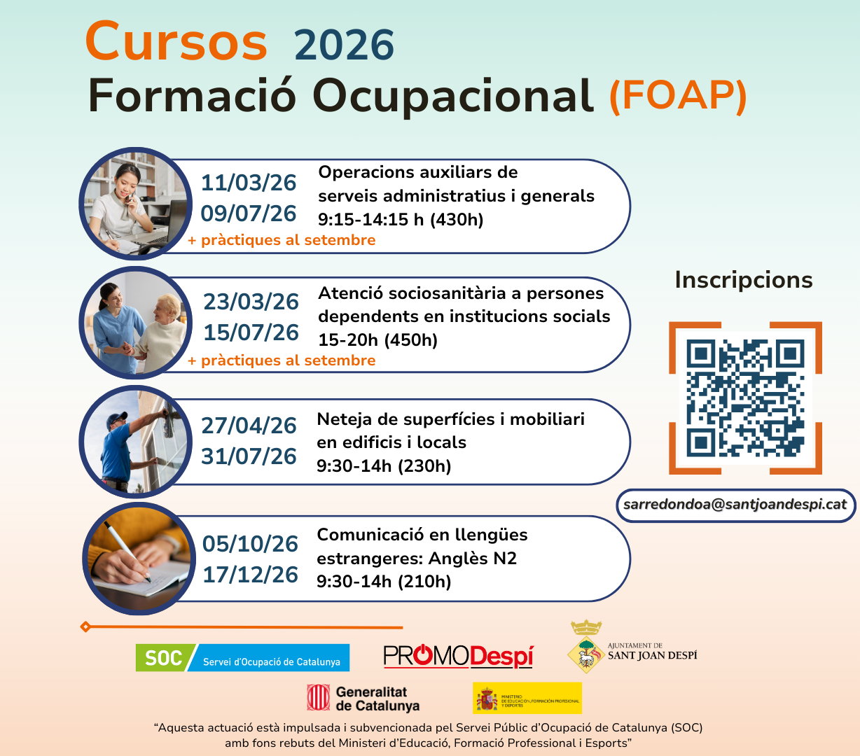 És la formació destinada prioritàriament a persones que es troben en situació d’atur. Està subvencionada pel SOC, Generalitat de Catalunya Departament d’Empresa i Ocupació, Ministerio de Empleo y Seguridad Social, Fons Social Europeo i l’Ajuntament de Sant Joan Despí, amb acreditació oficial per part del Departament de Treball, Afers Socials i Famílies de la Generalitat de Catalunya, a través del SOC.